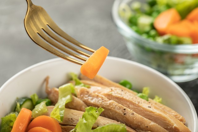选择瘦肉(鸡胸肉或火鸡胸肉)和多种蔬菜来制作沙拉。可以加入橄榄油和柠檬汁作为简单的调味料。