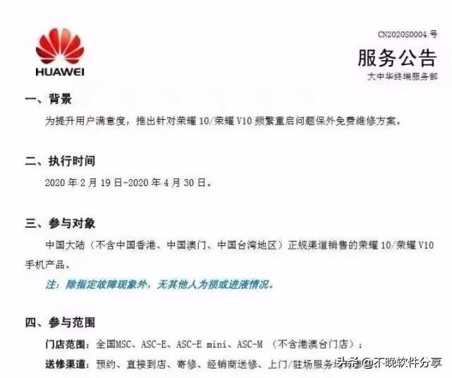问题发酵后,网上流传一份未经证实的华为服务公告,其中显示荣耀10/V10用户可以在4月30日之前享受保外免费维修服务,部分网友也在网上分享了成功更换主板的案例。