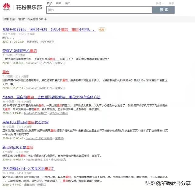 据网友反馈称,搭载麒麟970系列的机型在升级新版EMUI之后出现频繁重启的情况,包括在开机、使用时,严重的时候一天重启达十几次,严重影响使用体验。而在华为官方论坛花费俱乐部搜索“重启”关键词,可以发现问题已经非常普遍。