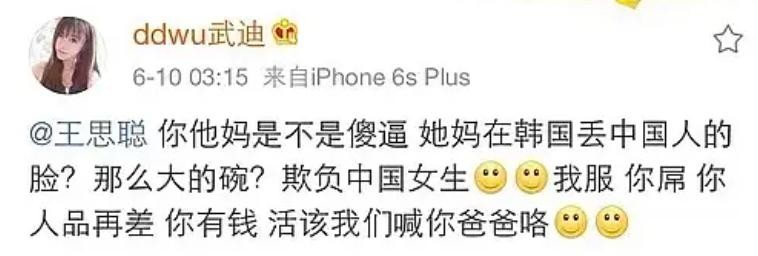 事情曝光后,王思聪非但没有认错,还在这条动态下评论说以后见武迪一次就打她一次。