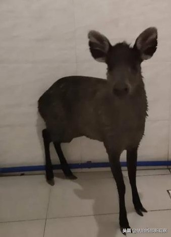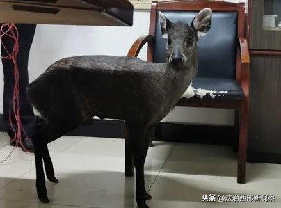 在农家乐现场,派出所民警在林业部门的帮助下,初步认定了这只野生动物为——毛冠鹿。这类野生动物性情温顺,攻击性不强,考虑到当时的情况,民警们决定将毛冠鹿带往派出所,并将其暂时安置在派出所会议室。
