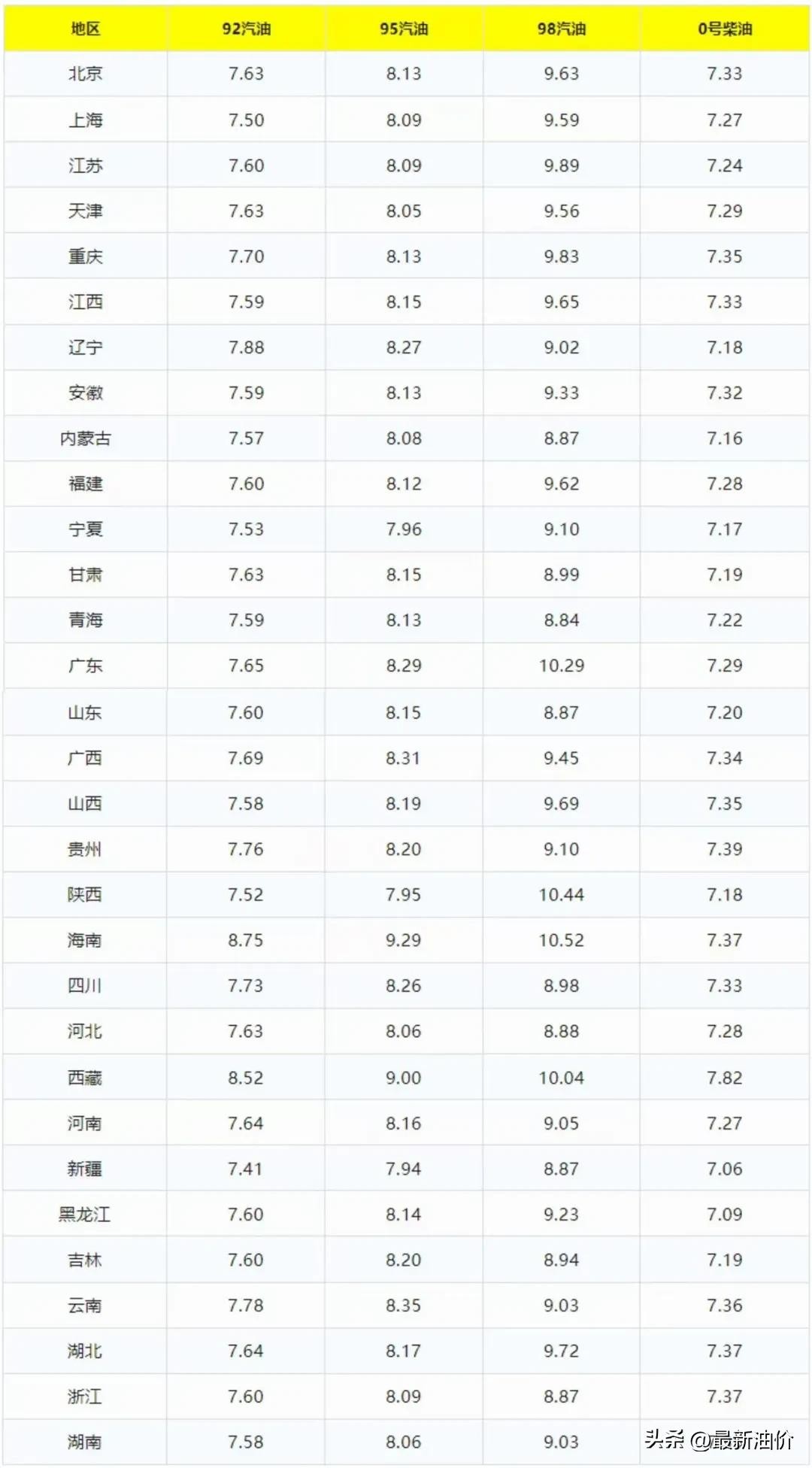 2月24日全国各省市汽油价格表: