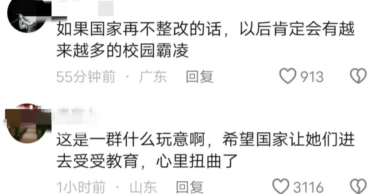 网友们看到后也是纷纷谴责,痛斥施暴者心理扭曲,要求国家出台相关政策严惩此类行为。像这种未成年人之所以如此嚣张,还不是仗着法律的保护么?