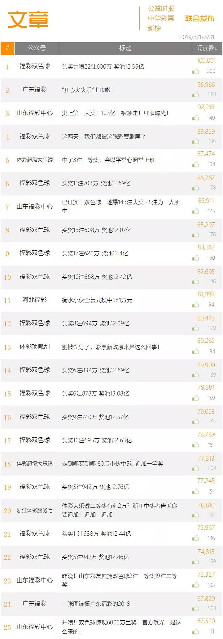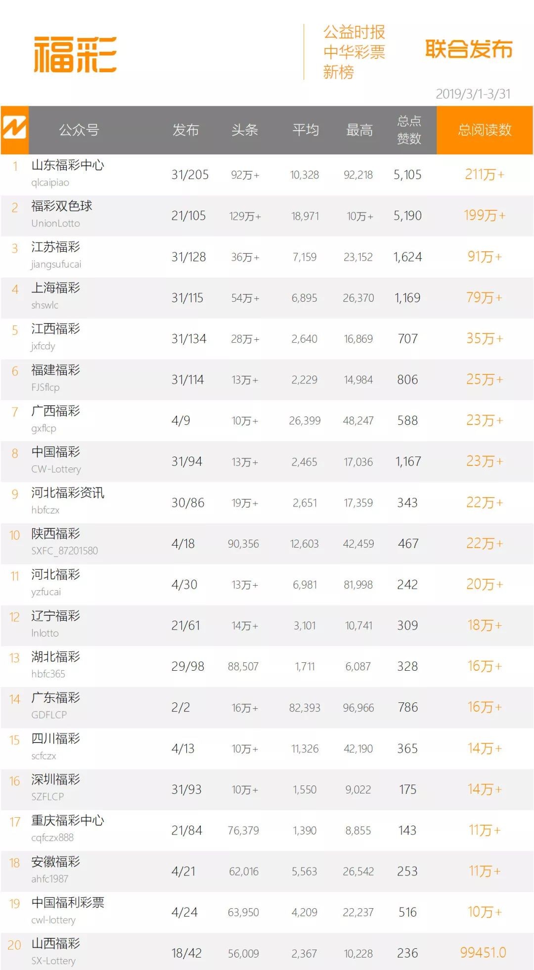 公益时报中华彩票网今日发布“彩票新媒体排行榜”2019年第3期,榜单由各地福、体彩中心服务号和订阅号组成,通过各公众号每月数据生成榜单,本期榜单的监测时间为3月1日-3月31日。