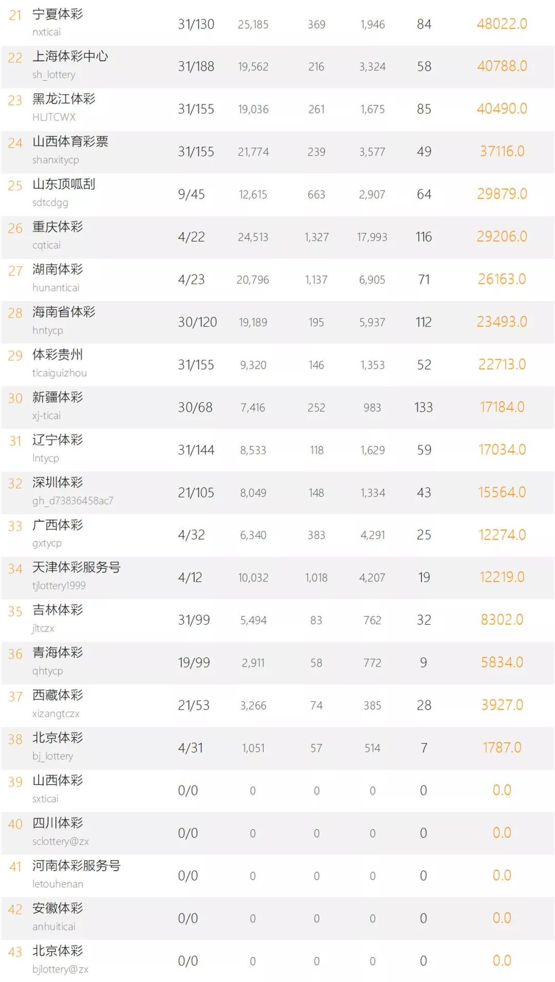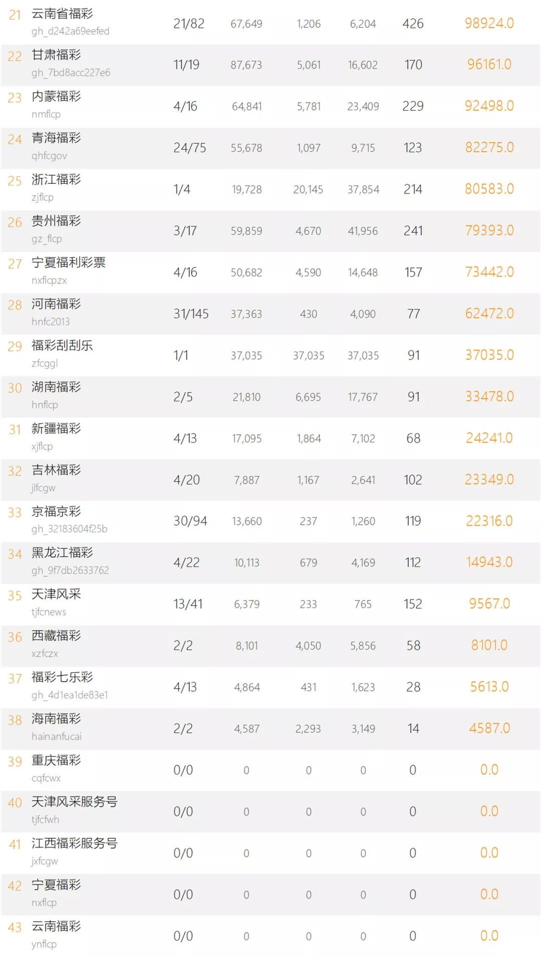 2019年第3期榜单,前20名中有11家福彩公众号上榜,其中山东福彩以211万阅读数蝉联福彩公众号榜首,总榜第二位。福建福彩和河北福彩资讯首次进入总榜前20名。