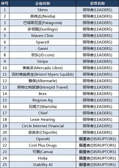 “领导者”部分以Skims、英伟达、巴塔哥尼亚、多邻国、Maven Clinic为代表;