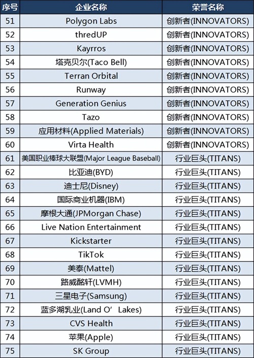 “行业巨头”部分以美国职业棒球大联盟、比亚迪、迪士尼、国际商业机器、摩根大通为代表,这也是公众识别度最高的一部分,还包括了三星、苹果、微软、西门子等超级企业;