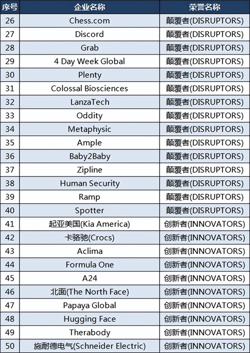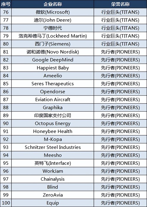 榜单共分为领导者、颠覆者、创新者、行业巨头、先行者五个部分,每个部分各有20家企业上榜,榜单中绝大多数企业都来自美国及欧洲,小部分来自亚洲的中国、日本、韩国。