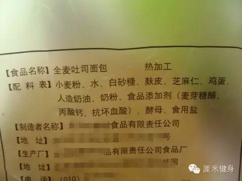 食品伪装界的另一大市场赢家就是在减肥食谱里常见的“全麦面包”。以下图为例,市场上售卖的全麦面包配料里居然没有全麦粉。。。含量最多的是小麦粉。。。所以这完全就是披着全麦外衣的普通吐司而已。