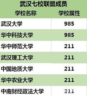 武汉七校联盟,是指武汉七所教育部直属高等学校之间实施的一种联合办学模式。七校从1999年开始联合办学,这七所高校的本科生,可以任选其中一所学校的公共选修课或专业课,可拿双学位,相当于“一张录取通知书,可上七所名校”。因为七所大学处在同一城市,所以这些政策实施和执行比较容易,学生跨校上课相对方便,所以效果比其他联盟显著,也更受学生欢迎!
