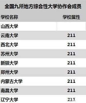人称“地方C9联盟”,协作会成立于1994年,最初创始会员高校杭州大学于1998年并入浙江大学,逐步稳定成现在9所高校,这9所地方综合性大学中,目前只有山西大学是非211高校。协作会成员每年会举行一次会议,交流办学经验、相互促进。
