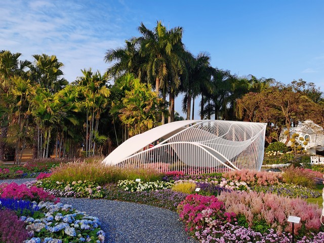 还有椰林掩映的如茵的草坪,波光粼粼、绿水如蓝的湖泊,洋溢着浓郁风情的热带、亚热带植物。是个有山有水的好地方,也是漫步郊游赏花的好去处。
