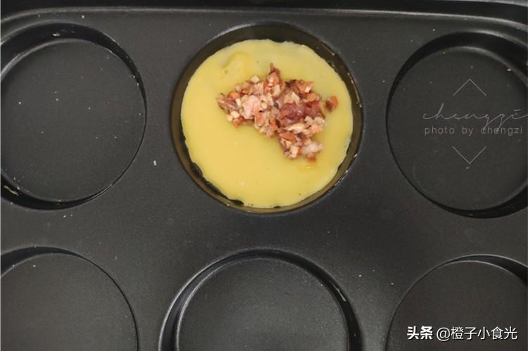 6、我用的是多功能锅,刚好有个六连盘,做蛋饺正合适,先把锅小火加热,舀入少许蛋液,待蛋液底部凝固,而表面还未完全凝固时,放入肉馅。