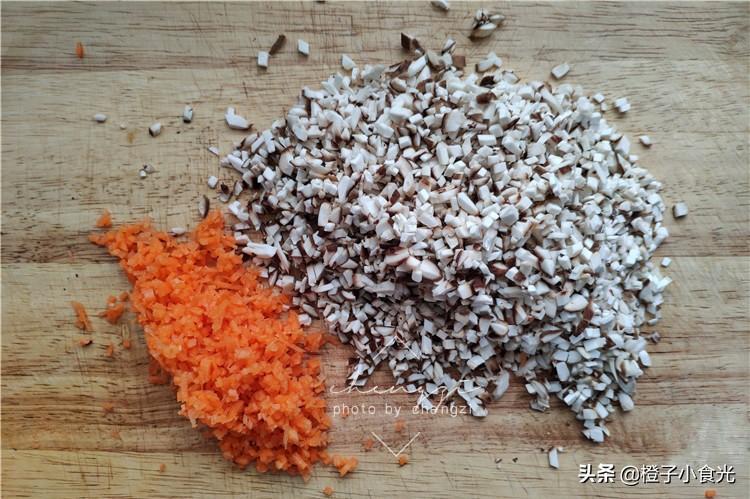 2、几个香菇和少许胡萝卜都切碎,也可以放入莲藕、豆腐等其他食材。