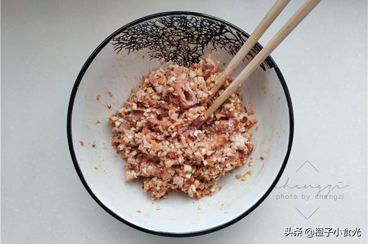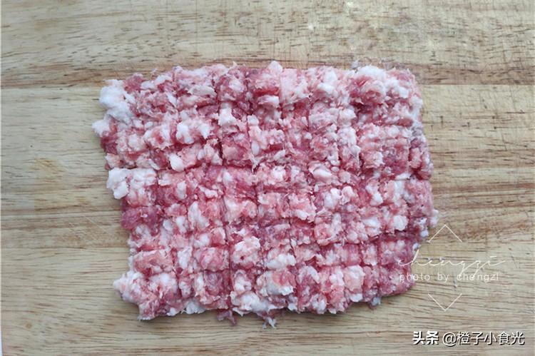 1、猪梅花肉用刀剁成细腻的猪肉馅,要稍稍带点肥肉,不要纯瘦肉会太柴口感不好。
