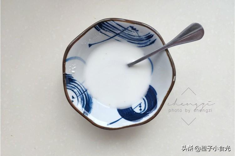 4、少许淀粉加入小碗中,再加少许清水搅拌均匀,形成淀粉水。