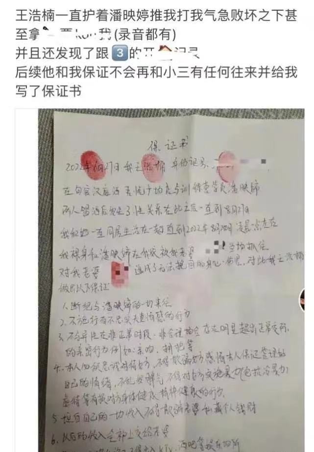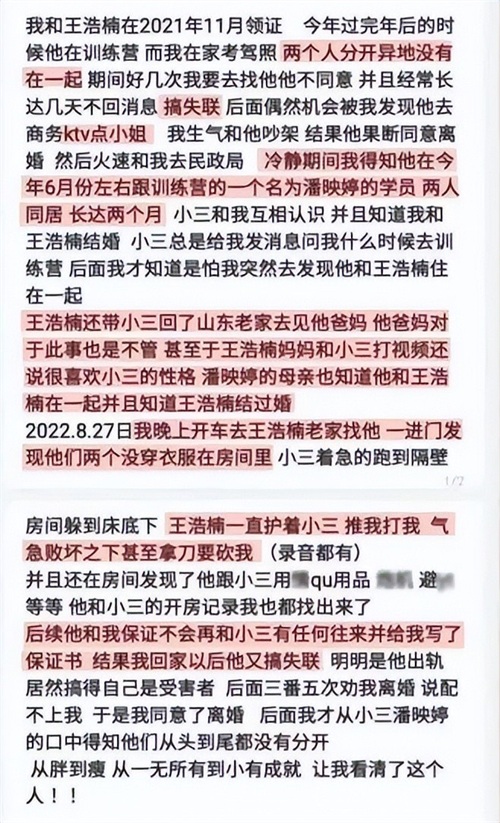 他态度嚣张、出言不逊,让妻子伤心不已,最后妻子忍无可忍在社交平台上多次发文、放上证据,曝光了王浩楠的不堪行径。