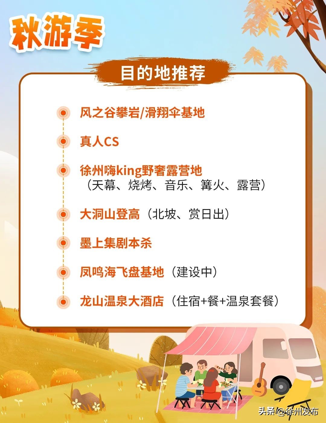 自驾攻略:风之谷→20分钟车程→滑翔伞基地→10分钟→宏图真人CS→5分钟→徐州嗨king野奢露营地→10分钟→大洞山登高→10分钟→墨上集→5分钟→凤鸣海飞盘基地→5分钟→龙山温泉大酒店