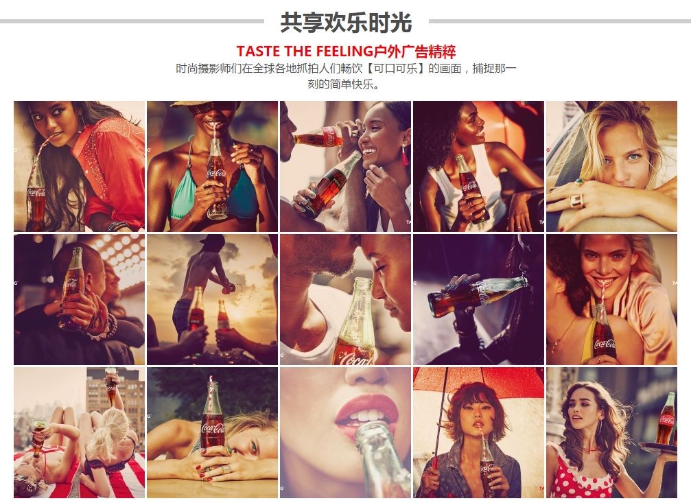 你可以看到可口可乐通过品牌的视觉化呈现,将“分享”“快乐”“欢聚”的情感带入到这些产品中,想方设法地潜入你的生活不停地给你洗脑:“我是潮流符号、我是文化符号、我还是生活符号!”