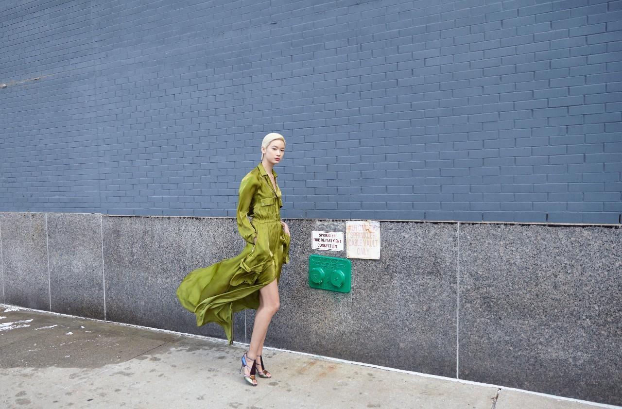 尤其是穿这条Lacoste2016春夏系列长裙时,Kiki的敬业度也让现场所有工作人员钦佩。在寒冷大风的纽约秀场外,Kiki为了服装的效果,竟然拒绝暖宝宝等保暖措施,在大风中拍完了我们的街拍图,真是不服不行啊!