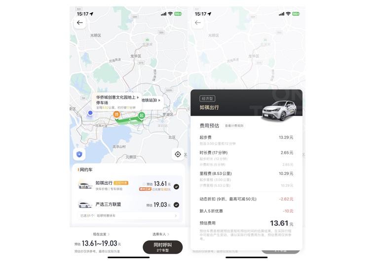 相较于曹操出行,以深圳地区为例,如祺出行网约车在软件界面提供两种快车选择,并有为乘客预估乘车费用区间,以快车服务打车8.52公里的距离为例,预估费用13.61元,预估费用包含了起步价、时长费和里程费,如果有折扣福利活动还会显示优惠了多少钱,有了各项费用明细的预估,乘客心里自然踏实不少。