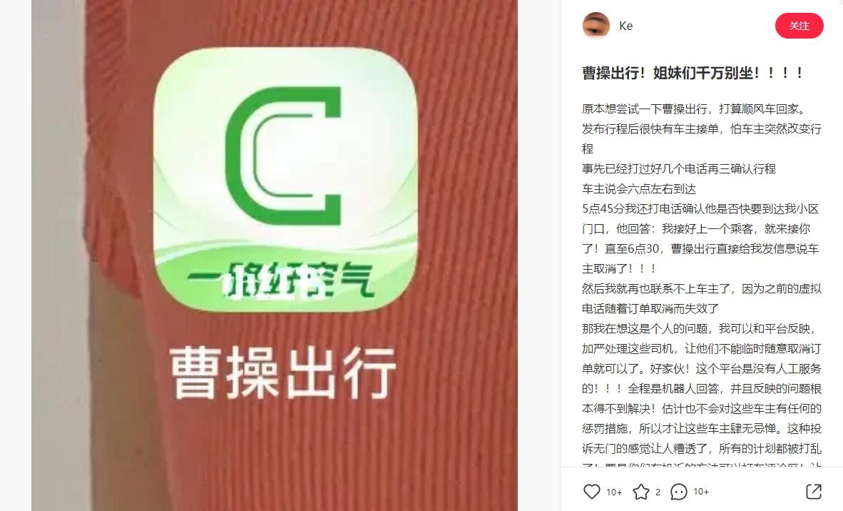 曹操出行虽不至于简单的几步就能注册成为网约车司机,但司机服务上有不少诟病。在顺风车服务中,乘客被司机单方面取消订单、司机失联的情况常有发生,严重打乱了乘客的出行计划,最后只能重新下单叫车。至于曹操出行平台对司机单方面取消订单、失联的情况做何处罚作为消费者可能一无所知,只能自担后果。