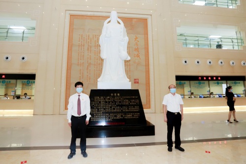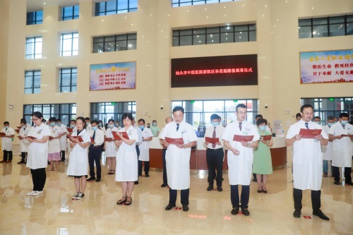 上午八点半,汕头市中医医院党委书记林创坚和汕头市卫生健康局副局长叶镇鹏在医院门诊大厅为孙思邈雕像揭幕,全体人员行鞠躬礼,诵读《大医精诚》。