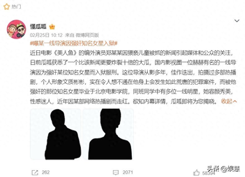 2月25日上午,狗仔懂瓜呱通过社交媒体曝出某一线导演因强奸某知名女星而入狱的消息,很快引起了全网的关注和猜测。