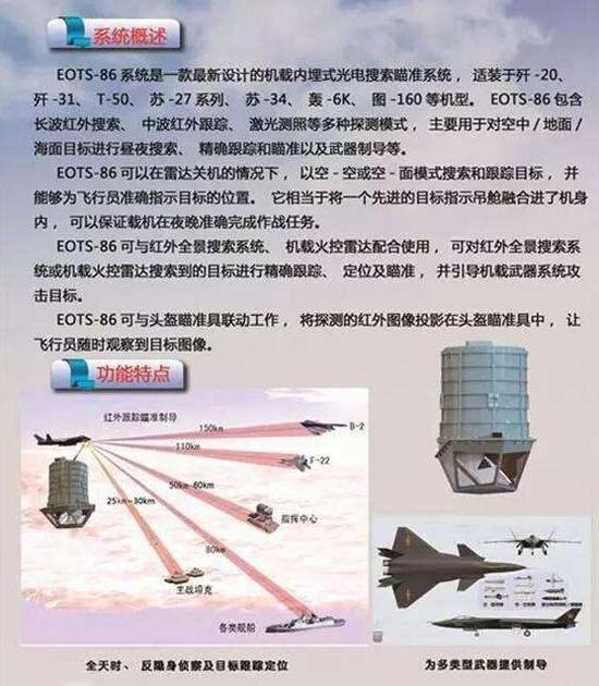 按照之前曝光的消息来看,歼20的火控雷达采用的是第三代有源相控阵雷达,T/R组件采用的是氮化镓组件,领先F35一代。和F35一样,歼20同样装备EOTS和EODAS,以及加密数据链。