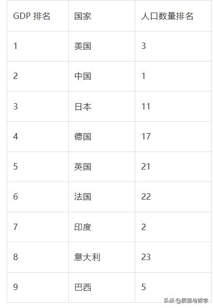 GDP排名靠前的国家,人口数量排名也靠前。而人口数量排名靠前的国家,GDP不一定靠前。