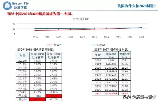 备注:中国属于发展中国家,GDP增幅放缓,所以取GDP增幅最小值6.60%,美国属于发达国家,GDP增幅平稳,所以取GDP平均值1.73%,进行预估,中国GDP将在2025年左右(2025~2027之间)超过美国成为世界第一。(是2025还是2027取决于贸易战的结果)