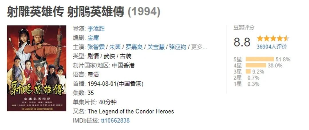 这版由香港无线的金牌监制李添胜亲自执导,品质和口碑都不错,朱茵的形象也非常符合原著中黄蓉的描写。当年,香港歌坛影坛都还处在黄金时期,只可惜无线对这版《射雕英雄传》的重视程度远不及1983版。