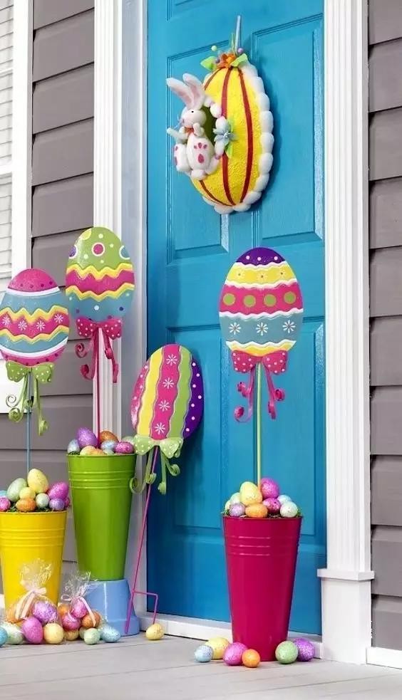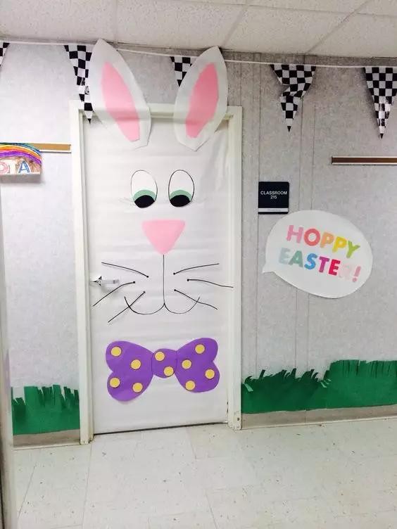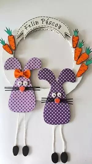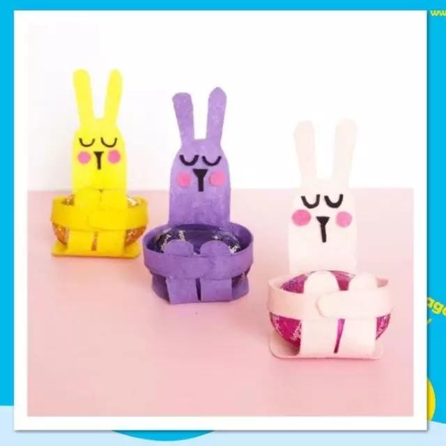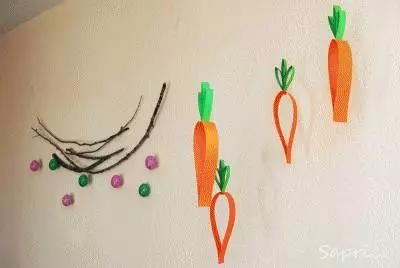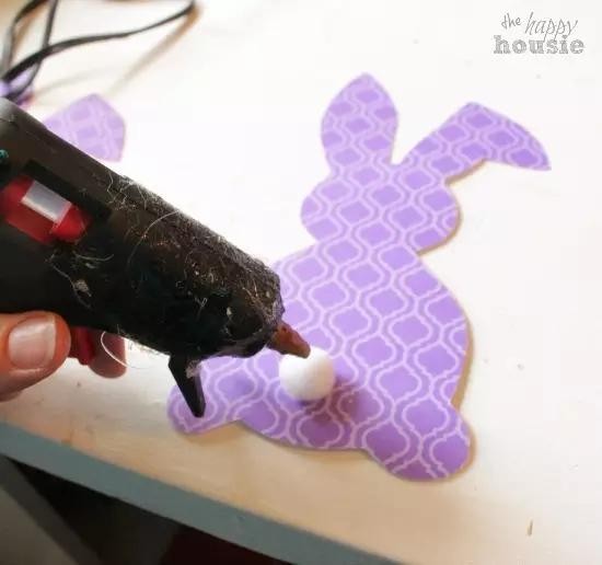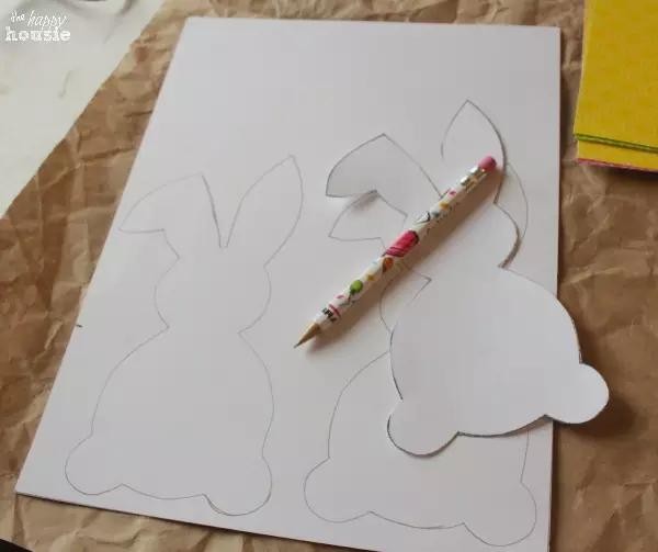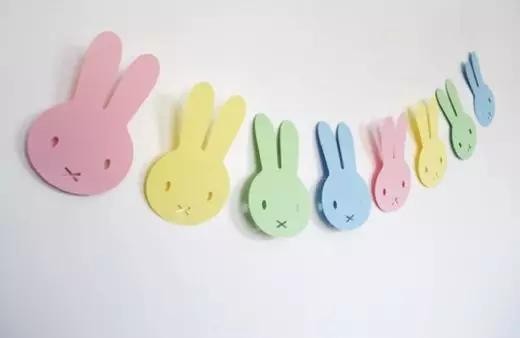 2.用多种彩色卡纸复制出多只小兔子,并用热胶枪黏上小毛球尾巴