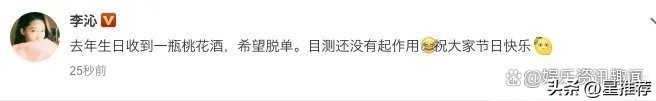 可李沁曾发文否认恋情,说生日收到桃花酒都还没脱单。