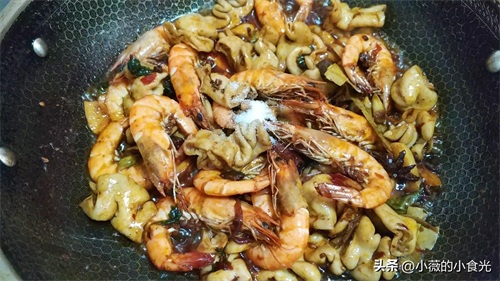放入肥肠炒1分钟。加适量盐 1勺蚝油