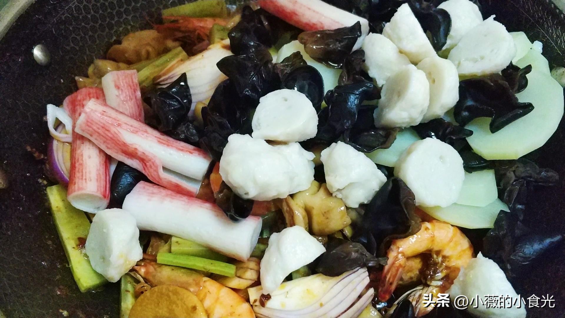放入焯好的木耳、土豆、蟹棒和鱼丸,出锅前撒鸡精,并淋入香油