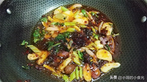 待料油炒香,香料颜色变深时放入1勺郫县豆瓣酱,1块火锅底料炒出红油。放半勺白糖 1勺料酒 2勺生抽调味