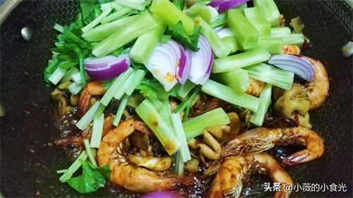 放莴笋条、洋葱丝和香芹段炒20秒,蔬菜要保证清脆的口感,炒至断生就行