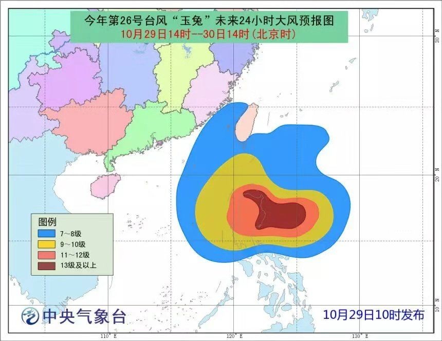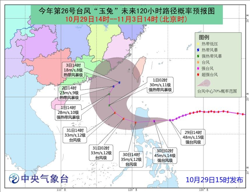 中央气象台预测,“玉兔”穿过菲律宾吕宋岛北部于30日下午到夜间进入南海东部海域,逐渐转向偏北方向移动,移速减慢,之后强度开始明显减弱。