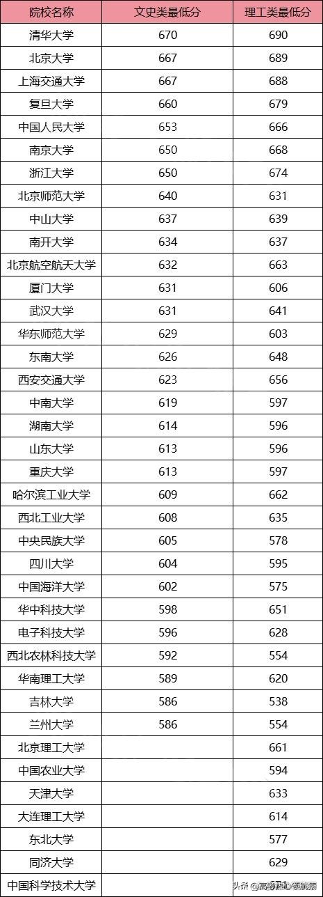 吉林大学(文科582分、理科538分)、兰州大学(文科582分、理科554分)、西北农林科技大学(文科592分、理科554分)、电子科技大学(文科596分)、东北大学(理科577分)、中国海洋大学(575分)。