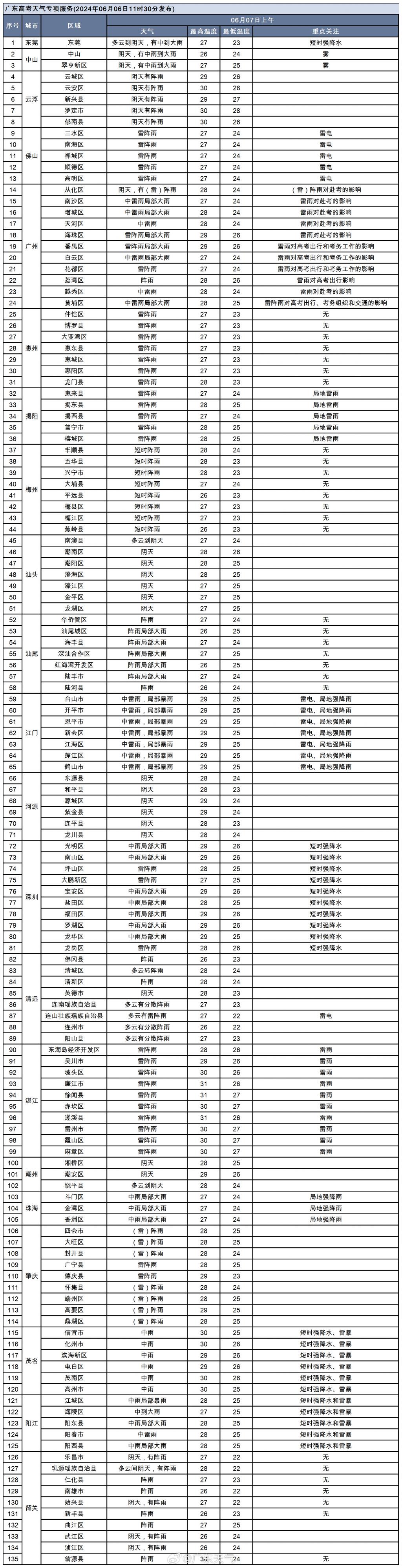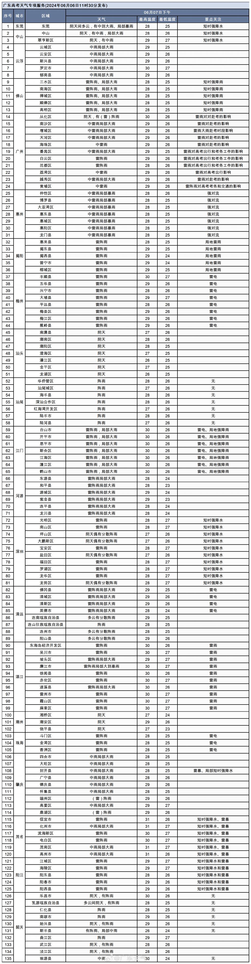 2024 年广东高考首日不同地区天气预报如下(6 月 6 日 11 时 30 分发布),请查收!