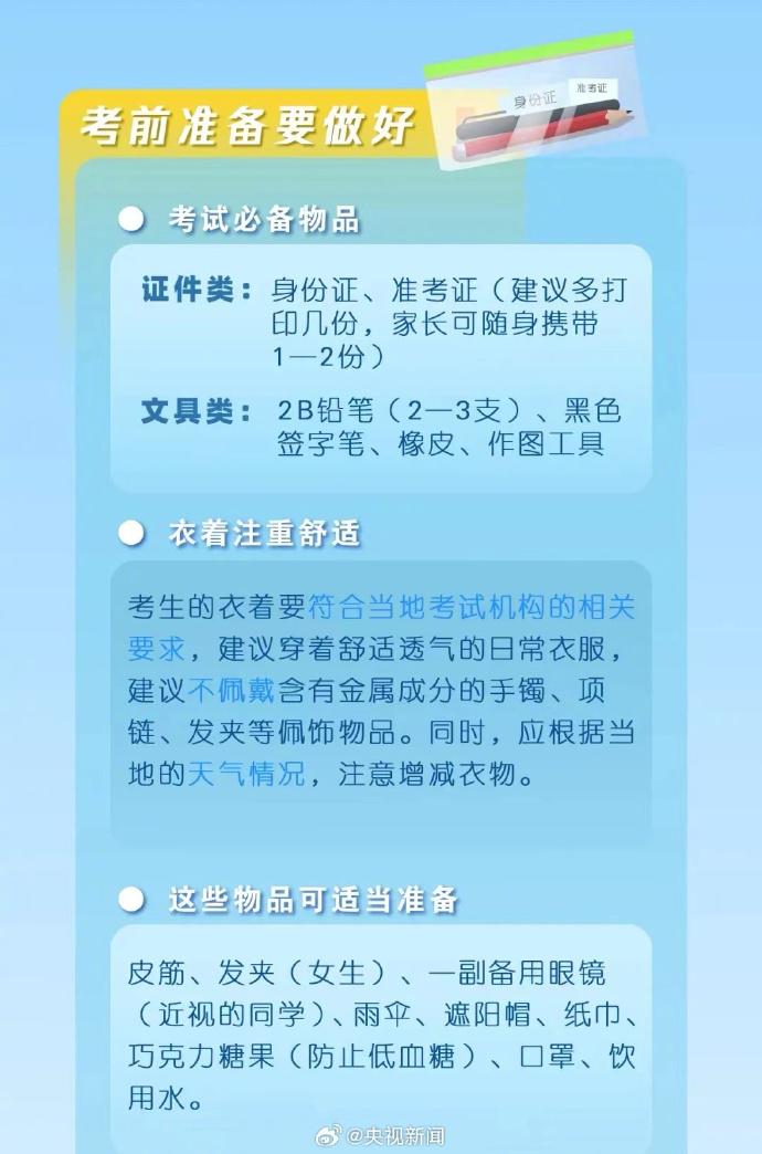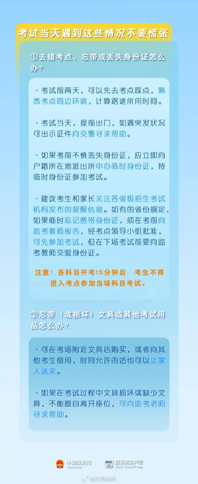 此外,考生要注意,如遇突发极端天气并发布相应延迟上学、停课级别的预警信号,不涉及停考。
