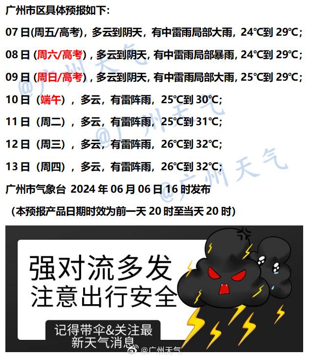 广州方面,7 日 -9 日(高考期间)有雷阵雨,降水主要集中在早晨和午后时段,其间或伴有短时强降水、6-8 级短时大风和雷电,最大小时雨强 20~40 毫米。