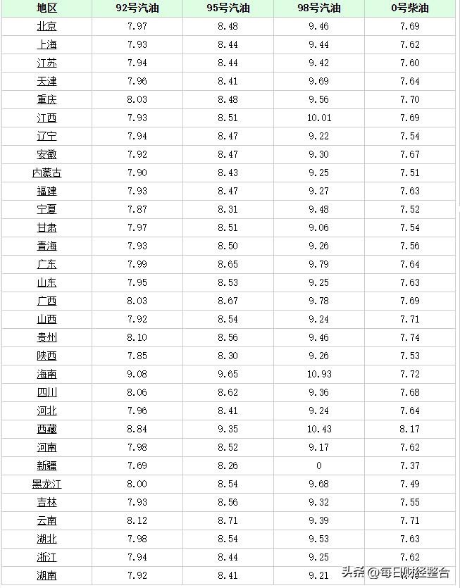 下边我们来看下全国中石油、中石化等主营加油站柴油;92、95汽油调后价信息,以下仅以部分地区的中石油、中海油和中石化加油站的92号、95号汽油价格和0号柴油价格信息举例说明。