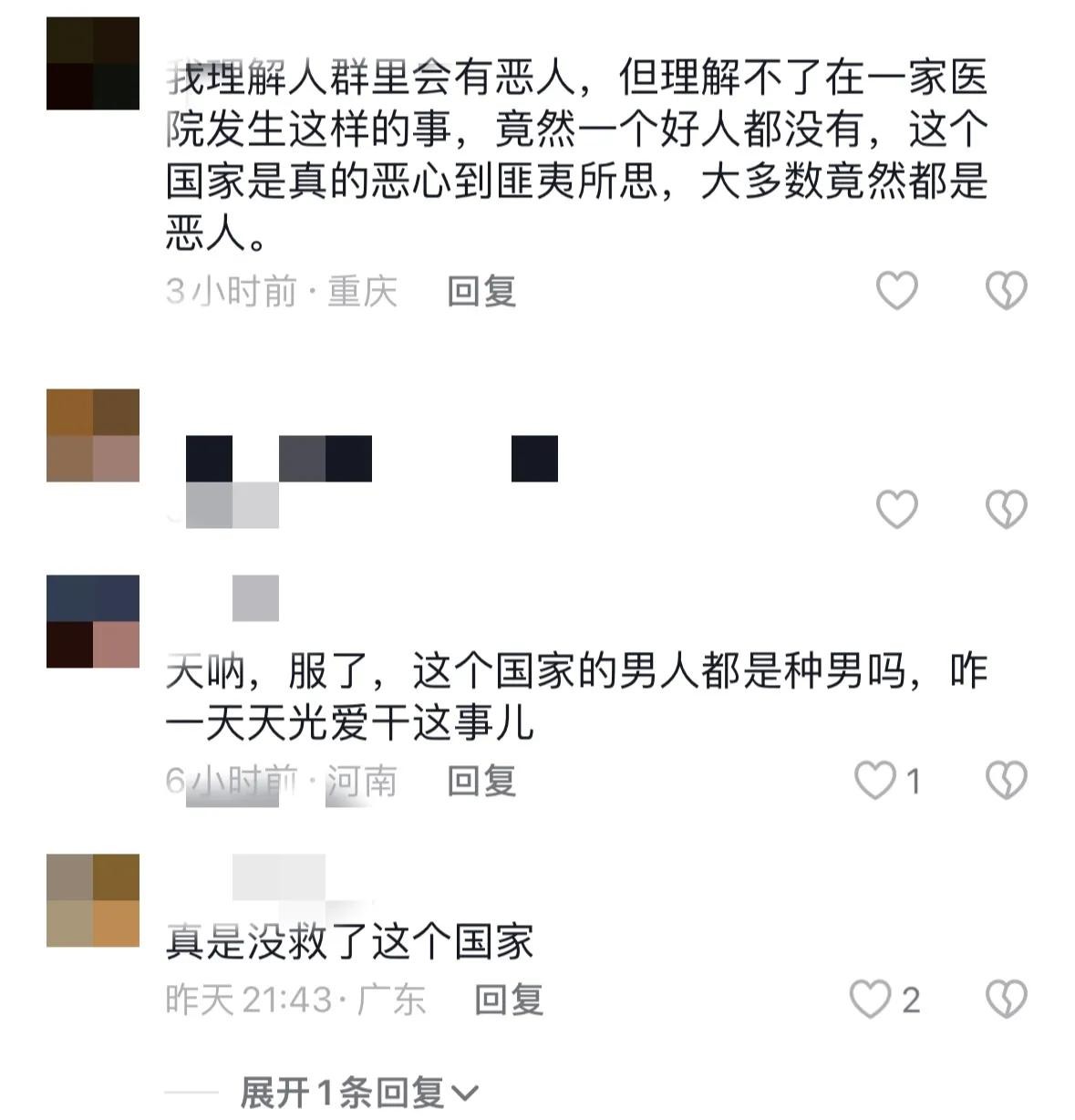 先来看看网友怎么说:看到了强奸 不是制止而是加入 真逆天,真的不可思议,他们国家就这么不重视教育,理解人群里会有恶人,但理解不了在一家医院发生这样的事,竟然一个好人都没有,这个国家是真的恶心到匪夷所思,大多数竟然都是恶人。天呐,服了,这个国家的男人都是种男吗?真是可怕的男人!感恩生在华夏!