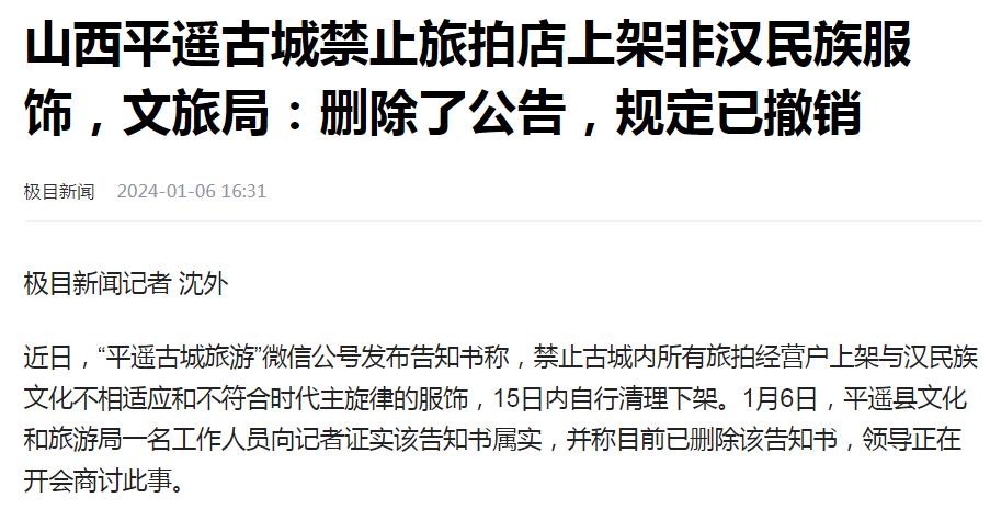 山西平遥古城,当地文旅局发公告,禁止旅拍店上架非汉民族服饰。舆论关注后,删除了公告,规定撤销。