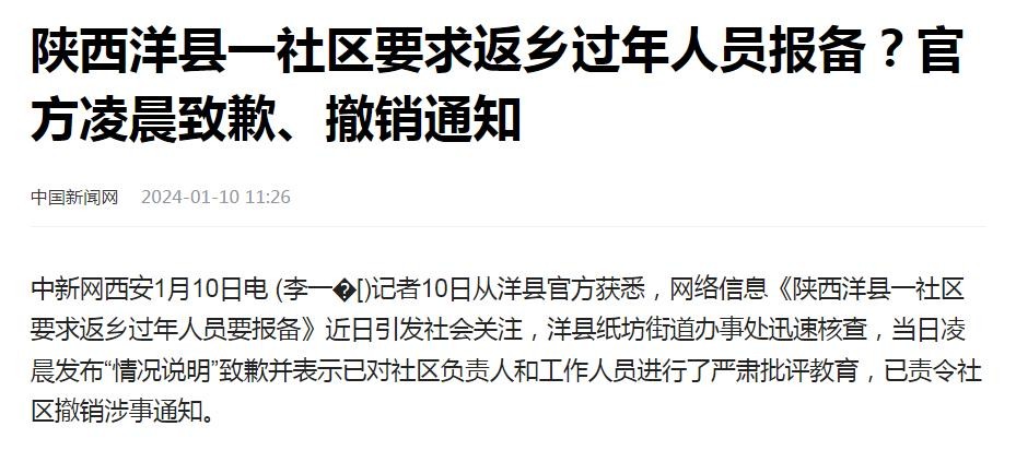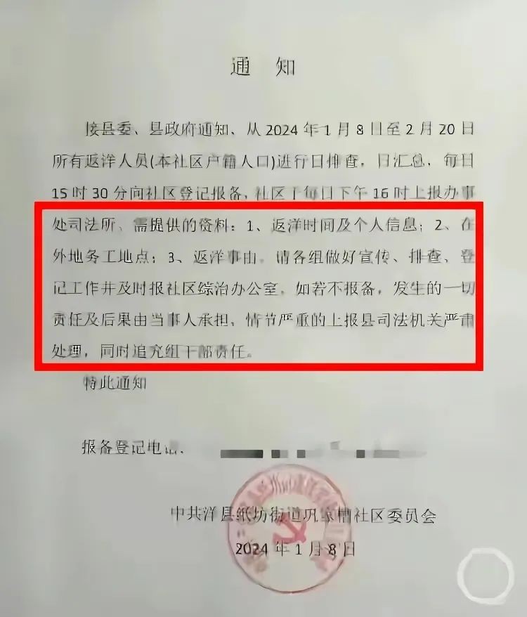 陕西洋县,一社区要求返乡过年人员报备,要求相关人员提供返洋时间及个人信息、在外地务工地点等资料。舆论关注后,该通知被撤销。