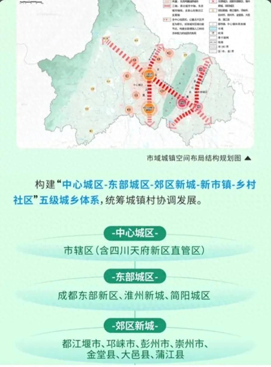 成都新的国土空间总体规划(2021-2035年)要构建“中心城区-东部城区-郊区新城-新市镇-乡村社区”五级城乡体系。其中不仅扩大了成都中心城区的范围,同时也重新定义了东部城区。