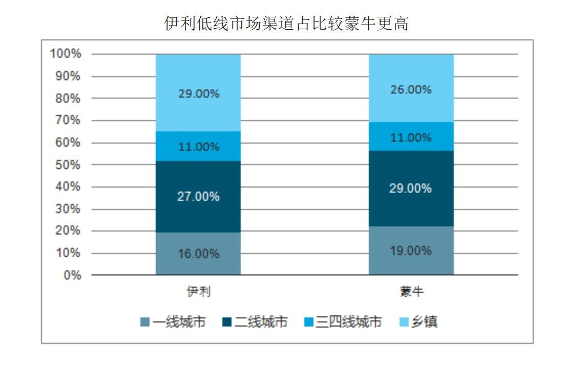 据中国产业信息网资料显示,目前,伊利在三、四线及乡镇市场的渠道占比达到 40%,蒙牛为 36%。与此对应的, 伊利在三、四线及乡镇市场的市占率达到 33%-35%, 而蒙牛则为 28-32%。