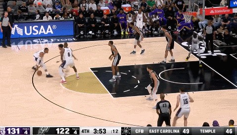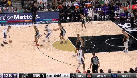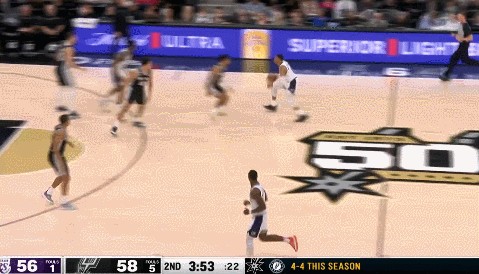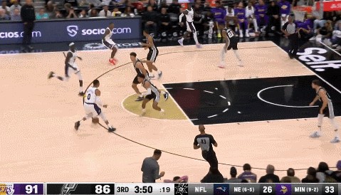 33.5秒,威少右路单打朗福德时,传给纳恩上篮得手,